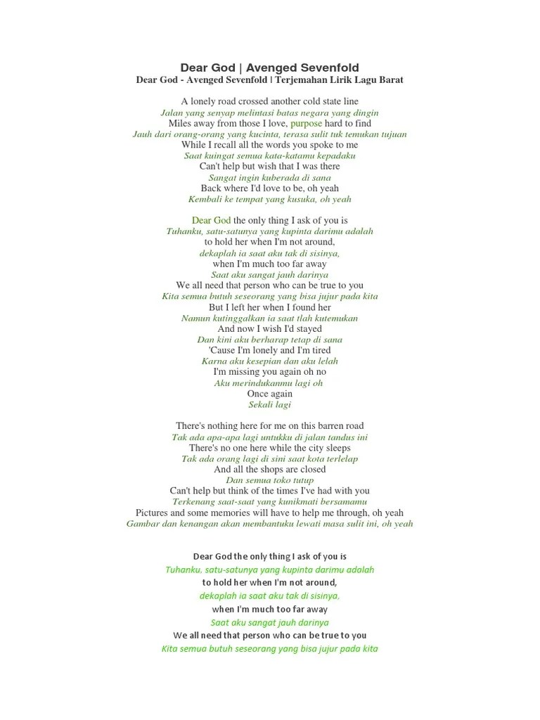 Berikut ini lirik lagu dan terjemahan . Lagu yang diciptakan pada tahun 2007 ini sebagai gambaran keluh kesah seseorang kepada tuhan. Dear god merupakan lagu yang romantis dari band avenged sevenfold, yang berkisah tentang seorang pria (penulis lagu) yang mau tak mau harus . Miles away from those i love, purpose hard to find A lonely road, crossed another cold state line.
